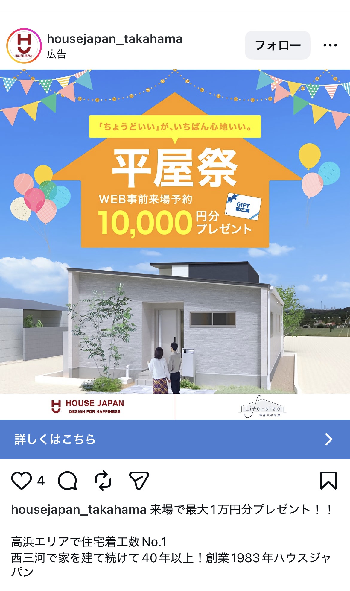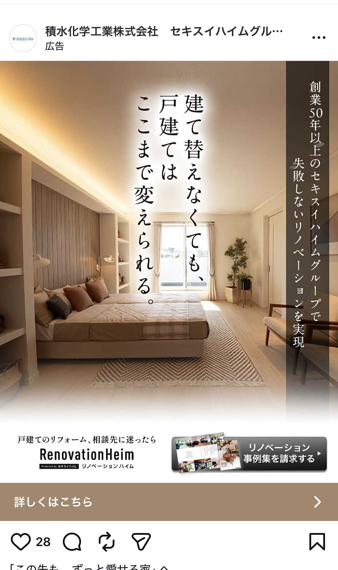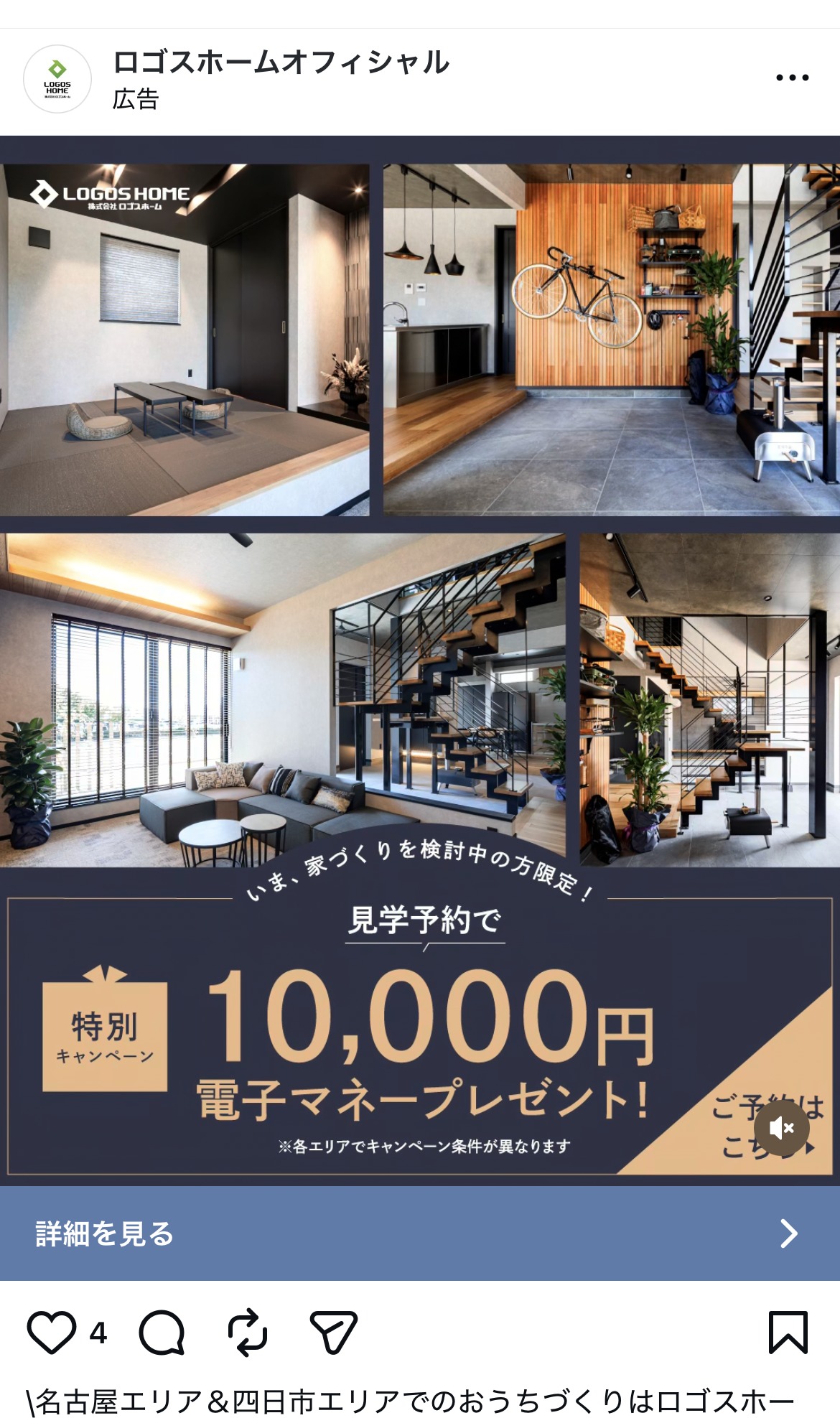 nipponjuken グレー 住宅・不動産 女性 ビジュアル写真 この広告主のライブラリをみる daikichi_franchise オレンジ・きいろ BtoB・事業者向け スクール・講座・コミュニティ 起業家・経営者 初心者 テキストメイン この広告主のライブラリをみる youhouse__daiyuu あお 住宅・不動産 女性 ママ ビジュアル写真 この広告主のライブラリをみる arrgallery_official あお 住宅・不動産 起業家・経営者 男性 ビジュアル写真 この広告主のライブラリをみる sanritsupc_official あお 住宅・不動産 女性 男性 ビジュアル写真 この広告主のライブラリをみる tamahome_official あか 住宅・不動産 初心者 イラスト・図解 この広告主のライブラリをみる ロゴスホームオフィシャル あお 住宅・不動産 初心者 ビジュアル写真 この広告主のライブラリをみる 積水化学工業株式会社 セキスイハイムグル… ベージュ・ゴールド 住宅・不動産 女性 男性 ビジュアル写真 この広告主のライブラリをみる housejapan_takahama あお 住宅・不動産 女性 男性 ビジュアル写真 この広告主のライブラリをみる SUUMO(スーモ) 黒 住宅・不動産 初心者 ビジュアル写真 この広告主のライブラリをみる スーモカウンター ピンク 住宅・不動産 スクール・講座・コミュニティ 初心者 ビジュアル写真 この広告主のライブラリをみる mics131 ピンク 住宅・不動産 BtoB・事業者向け 初心者 イラスト・図解 この広告主のライブラリをみる sekisuiheim_chubu あお 住宅・不動産 男性 ビジュアル写真 この広告主のライブラリをみる トヨタホーム名古屋株式会社 ベージュ・ゴールド 住宅・不動産 女性 ビジュアル写真 この広告主のライブラリをみる 神経と身体の研究ノート 黒 健康・整体・ウェルネス スクール・講座・コミュニティ 起業家・経営者 イラスト・図解 この広告主のライブラリをみる nell_mattress あお 住宅・不動産 初心者 ビジュアル写真 この広告主のライブラリをみる 1 2 3 … 76 次へ »