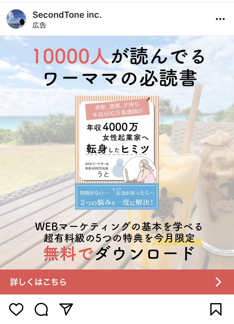 きらこ「強いオタク道」 あか むらさき 白 黒 スクール・講座・コミュニティ SNS・LINE集客 起業家・経営者 初心者 イラスト・図解 テキストメイン この広告主のライブラリをみる SecondTone inc. オレンジ・きいろ ピンク 白 マーケティング スクール・講座・コミュニティ 女性 ママ イラスト・図解 テキストメイン この広告主のライブラリをみる 株式会社宣伝会議(Sendenkaigi Co., Ltd.) あか 白 黒 ライティング・コピーライティング スクール・講座・コミュニティ 初心者 テキストメイン この広告主のライブラリをみる syoshiza0415 あか 白 黒 スクール・講座・コミュニティ SNS・LINE集客 起業家・経営者 フリーランス イラスト・図解 この広告主のライブラリをみる syoshiza0415 あか 白 ベージュ・ゴールド マーケティング スクール・講座・コミュニティ 女性 初心者 イラスト・図解 この広告主のライブラリをみる shicyusuimei オレンジ・きいろ あお ピンク スピリチュアル・占い スクール・講座・コミュニティ 女性 初心者 イラスト・図解 この広告主のライブラリをみる Season_in 白 グレー 黒 副業・初心者向けビジネス スクール・講座・コミュニティ 起業家・経営者 初心者 人物写真(モデル) この広告主のライブラリをみる 野畑さやか あお むらさき ピンク 営業・セールス スクール・講座・コミュニティ 起業家・経営者 女性 イラスト・図解 テキストメイン この広告主のライブラリをみる SecondTone inc. あか みどり 白 黒 副業・初心者向けビジネス スクール・講座・コミュニティ 女性 ママ イラスト・図解 この広告主のライブラリをみる 大和民族大學校 あか 白 黒 マーケティング スクール・講座・コミュニティ 起業家・経営者 テキストメイン この広告主のライブラリをみる 大和民族大學校 あか 白 黒 マーケティング スクール・講座・コミュニティ 起業家・経営者 テキストメイン この広告主のライブラリをみる 泉雄亮 白 黒 ベージュ・ゴールド マーケティング スクール・講座・コミュニティ 起業家・経営者 イラスト・図解 この広告主のライブラリをみる パーソナルオーダー戦略 オレンジ・きいろ ピンク 白 副業・初心者向けビジネス スクール・講座・コミュニティ 女性 ママ イラスト・図解 人物写真(本人) この広告主のライブラリをみる 完全保存版!売れすぎるコンテンツ販売の… 白 グレー 黒 副業・初心者向けビジネス スクール・講座・コミュニティ 起業家・経営者 初心者 イラスト・図解 この広告主のライブラリをみる 保志 吏衣子 みどり 白 ベージュ・ゴールド スクール・講座・コミュニティ 女性 人物写真(モデル) この広告主のライブラリをみる 花嫁プレスクール ピンク 白 黒 恋愛・婚活・パートナーシップ スクール・講座・コミュニティ 女性 人物写真(モデル) ビフォーアフター・比較 この広告主のライブラリをみる 投稿のページ送り 前へ 1 2 3 4 … 42 次へ