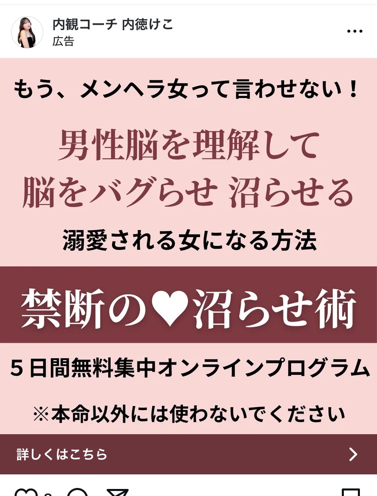 データ分析で地味な起業【データオーガナイザー養成講座】 茶 副業・初心者向けビジネス スクール・講座・コミュニティ 起業家・経営者 初心者 テキストメイン この広告主のライブラリをみる K2アカデミー 茶 マーケティング スクール・講座・コミュニティ 起業家・経営者 フリーランス テキストメイン この広告主のライブラリをみる ぬりマッチ 茶 不動産・住まい 初心者 イラスト・図解 この広告主のライブラリをみる yourkins_official 茶 健康・整体・ウェルネス 女性 テキストメイン この広告主のライブラリをみる Nbhストレピア 茶 コスメ・美容サービス 女性 人物写真(モデル) この広告主のライブラリをみる 潜在意識カウセリングダイエット 中川明美 茶 健康・整体・ウェルネス コーチング・心理学 女性 テキストメイン この広告主のライブラリをみる snaq.me 茶 健康・整体・ウェルネス 女性 テキストメイン この広告主のライブラリをみる basefood_tokyo 茶 健康・整体・ウェルネス 女性 ママ テキストメイン この広告主のライブラリをみる チャールズ・ミズラヒ 茶 マネー・金融・保険 起業家・経営者 テキストメイン この広告主のライブラリをみる 100_kigyo 茶 スクール・講座・コミュニティ SNS・LINE集客 起業家・経営者 フリーランス テキストメイン この広告主のライブラリをみる プロダクトローンチの専門家 田中祐一 茶 マーケティング スクール・講座・コミュニティ 起業家・経営者 テキストメイン この広告主のライブラリをみる 内観コーチ 内徳けこ 茶 恋愛・婚活・パートナーシップ スクール・講座・コミュニティ 女性 テキストメイン この広告主のライブラリをみる 経営者の【節税戦略】セミナー2023 茶 マネー・金融・保険 BtoB・事業者向け 起業家・経営者 人物写真(本人) この広告主のライブラリをみる 一刀 – ケン 茶 子育て・教育 女性 ママ 人物写真(本人) この広告主のライブラリをみる クラッソーネ 茶 不動産・住まい 起業家・経営者 テキストメイン この広告主のライブラリをみる nakamura_act 茶 マーケティング スクール・講座・コミュニティ 起業家・経営者 フリーランス イラスト・図解 この広告主のライブラリをみる 投稿のページ送り 1 2 次へ