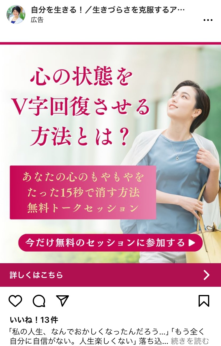Iq200グローバルキッズ 黒 子育て・教育 スクール・講座・コミュニティ 女性 ママ 人物写真(モデル) テキストメイン この広告主のライブラリをみる AUTOMATION MASTER ZERO グレー BtoB・事業者向け スクール・講座・コミュニティ 起業家・経営者 人物写真(モデル) テキストメイン この広告主のライブラリをみる TechSuite グレー ライティング・コピーライティング マーケティング 起業家・経営者 フリーランス 人物写真(モデル) テキストメイン この広告主のライブラリをみる 自分を生きる!/生きづらさを克服するア… ピンク コーチング・心理学 スクール・講座・コミュニティ 女性 人物写真(モデル) この広告主のライブラリをみる nbc__international むらさき BtoB・事業者向け 起業家・経営者 人物写真(モデル) この広告主のライブラリをみる サスティナブル・ライフデザインスクール 黒 マネー・金融・保険 スクール・講座・コミュニティ 起業家・経営者 ママ 人物写真(モデル) テキストメイン この広告主のライブラリをみる japan_design_school_official ピンク デザイナー・クリエイター スクール・講座・コミュニティ 女性 初心者 人物写真(モデル) テキストメイン この広告主のライブラリをみる kazukikaieda グレー SNS・LINE集客 起業家・経営者 人物写真(モデル) テキストメイン この広告主のライブラリをみる 独自コンテンツの つくりかた 白 マーケティング スクール・講座・コミュニティ 起業家・経営者 女性 人物写真(モデル) テキストメイン この広告主のライブラリをみる 法律事務所z あか マネー・金融・保険 初心者 人物写真(モデル) この広告主のライブラリをみる change_note_ あお 不動産・住まい 初心者 人物写真(モデル) この広告主のライブラリをみる 3ca_tae ピンク 恋愛・婚活・パートナーシップ 女性 人物写真(モデル) この広告主のライブラリをみる kazukikaieda 白 マーケティング スクール・講座・コミュニティ 起業家・経営者 女性 人物写真(モデル) テキストメイン この広告主のライブラリをみる 鎌倉小町通り眼科 グレー 健康・整体・ウェルネス コスメ・美容サービス 女性 人物写真(モデル) ビフォーアフター・比較 この広告主のライブラリをみる 投稿のページ送り 前へ 1 … 12 13 14 … 21 次へ