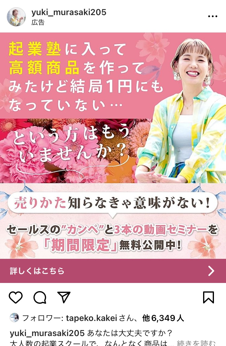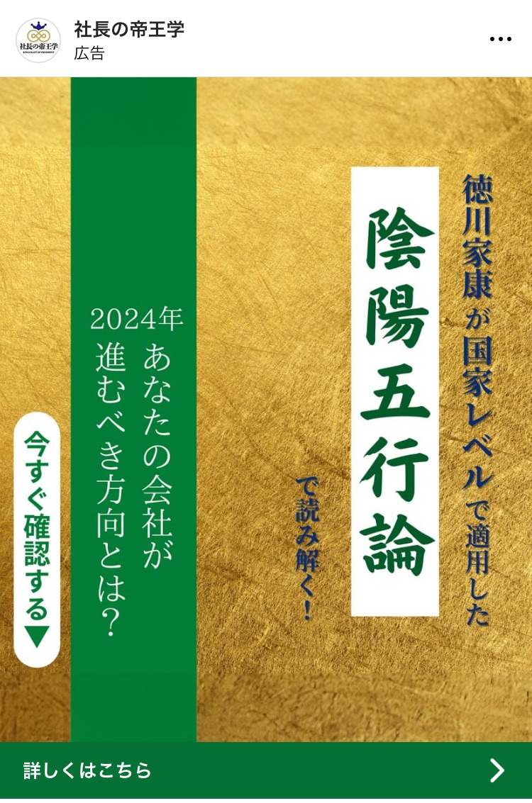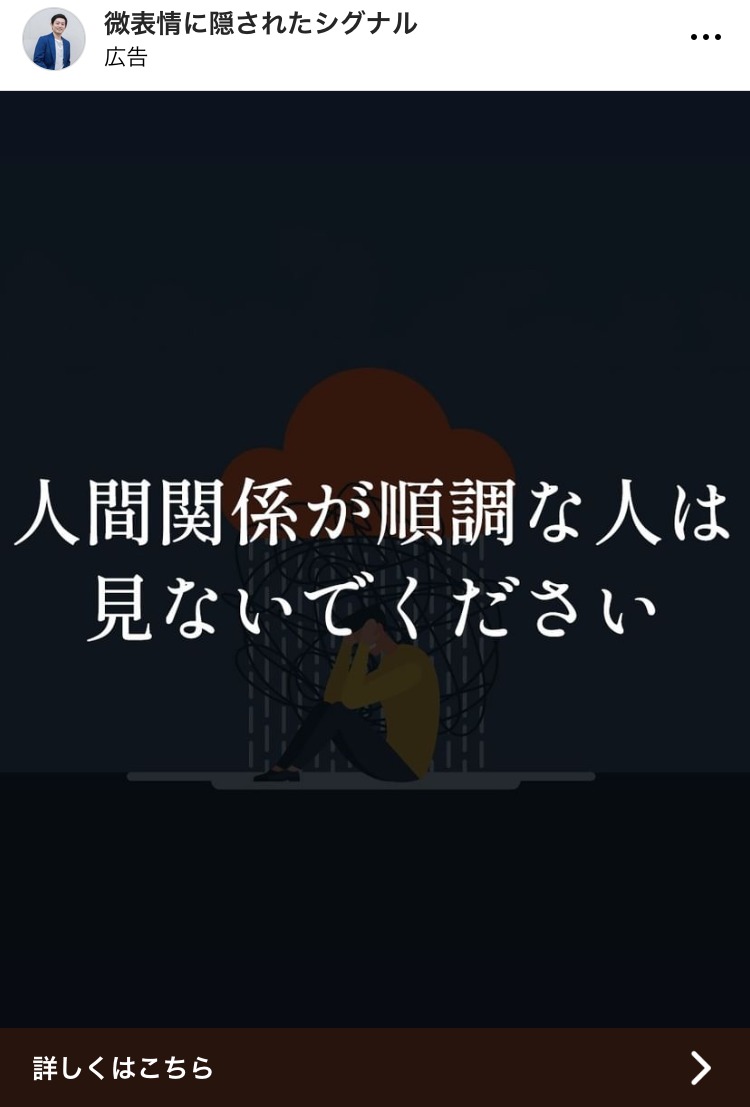 社長の帝王学 ベージュ・ゴールド BtoB・事業者向け スピリチュアル・占い 起業家・経営者 テキストメイン この広告主のライブラリをみる 微表情に隠されたシグナル 黒 コーチング・心理学 初心者 イラスト・図解 この広告主のライブラリをみる miho.bonmoment ピンク スピリチュアル・占い スクール・講座・コミュニティ 女性 テキストメイン この広告主のライブラリをみる crimsonglobalacademy あお 子育て・教育 スクール・講座・コミュニティ ママ 人物写真(モデル) この広告主のライブラリをみる kouhei_papa 白 副業・初心者向けビジネス スクール・講座・コミュニティ 初心者 テキストメイン この広告主のライブラリをみる 佐藤 貫太 あお 広告運用・広告集客 起業家・経営者 テキストメイン この広告主のライブラリをみる fivecare_kaz オレンジ・きいろ コスメ・美容サービス スクール・講座・コミュニティ 女性 人物写真(モデル) この広告主のライブラリをみる yuki_murasaki205 ピンク 営業・セールス スクール・講座・コミュニティ 起業家・経営者 女性 人物写真(本人) この広告主のライブラリをみる 100_kigyo 茶 スクール・講座・コミュニティ SNS・LINE集客 起業家・経営者 フリーランス テキストメイン この広告主のライブラリをみる マーケティングプロパートナーズ あお 求人・採用 マーケティング フリーランス 人物写真(モデル) この広告主のライブラリをみる 全く新しい速読法「瞬読」 グレー スクール・講座・コミュニティ 初心者 イラスト・図解 この広告主のライブラリをみる LINEヤフー for Business(LINEサービス) あか 広告運用・広告集客 起業家・経営者 イラスト・図解 テキストメイン この広告主のライブラリをみる ninoudeyukiko むらさき コスメ・美容サービス スクール・講座・コミュニティ 起業家・経営者 女性 人物写真(本人) この広告主のライブラリをみる LINE友だち追加計測ツール【L-ad】 あか 広告運用・広告集客 SNS・LINE集客 起業家・経営者 フリーランス テキストメイン この広告主のライブラリをみる ジョブセイバー みどり 求人・採用 女性 初心者 人物写真(モデル) この広告主のライブラリをみる SBC 湘南美容クリニック あか コスメ・美容サービス 女性 人物写真(モデル) この広告主のライブラリをみる « 前へ 1 … 44 45 46 47 48 … 76 次へ »